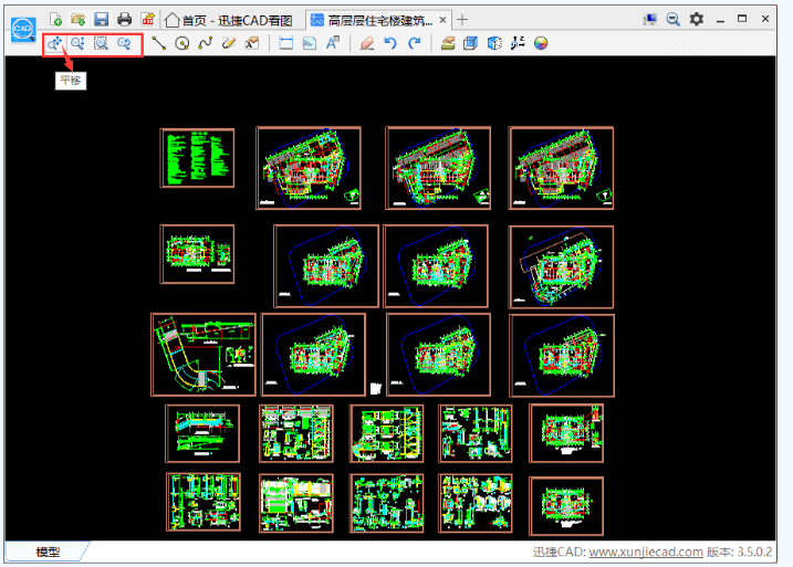 打开图纸,点击迅捷 CAD 看图软件工具栏中的平移、适时缩放、窗口放大、返回全图等选项,将图纸移动到适合的位置,