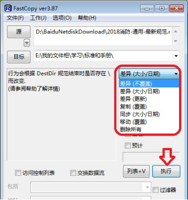 5. 点击图示倒△,根据用户情况(例如复制、移动、有重名文件)在其下菜单中选择合适的更新覆盖形式,这里选择【差异(不覆盖)】,然后点击【执行】。