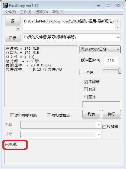 7. 文件成功从D盘复制到E盘。可以看到传输速度高达23M/S,远远高于直接复制拷贝的速度。