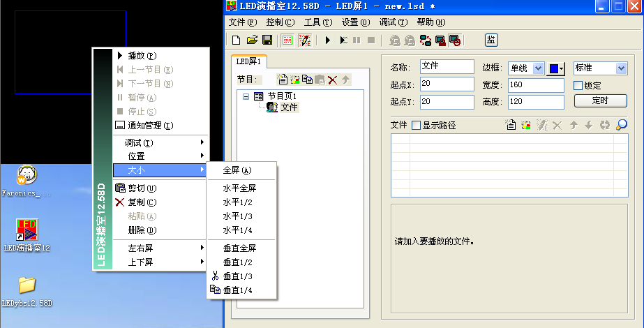 5. 在方框中任意位置右击,在其下拉菜单中依次选择【大小】—【全屏】,方框就会覆盖整个黑屏区域,即表示大屏上也会全屏播放。让我们回到 LED 演播室软件主界面,此时主界面右侧参数对应刚才设置的黑屏窗口。用户可以根据需要更改参数。