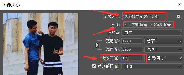 当然,我们也可以直接修改图片分辨率,提高分辨率,图片的宽高像素也会随之变大,如图,