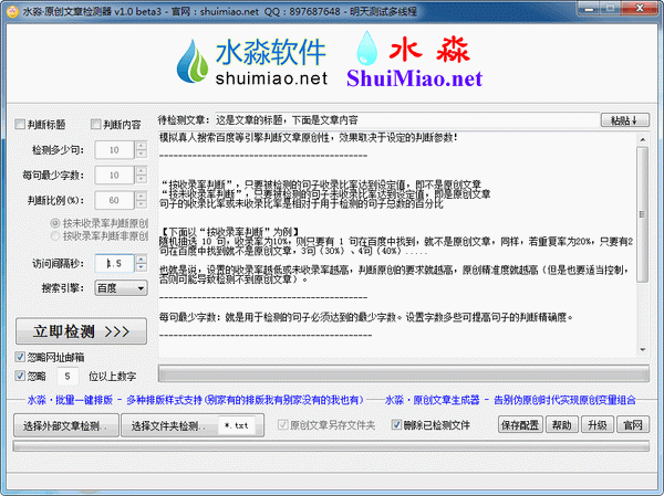 水淼原创文章检测器,这是一款小体积、免安装的文章原创度检测软件,支持多种搜索引擎,你可以先设定判断标准,软件即可模拟真人搜索来查看文章内容是否重复,最终效果取决于设定的判断参数。简单来说,你设置的收录率越低、或者未收录率越高,判断原创的要求就越高,原创精准度就越高(但是也要适当控制)。