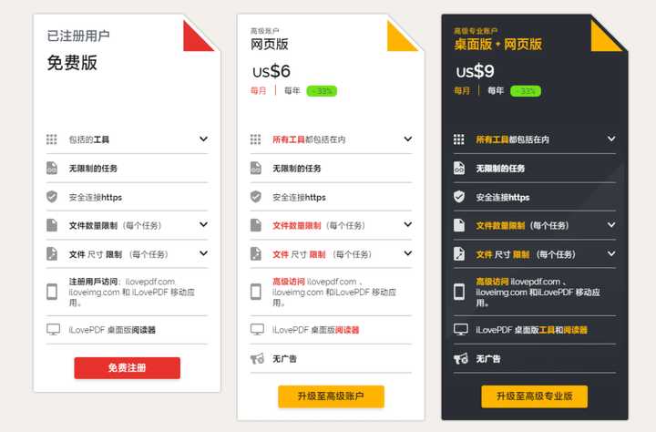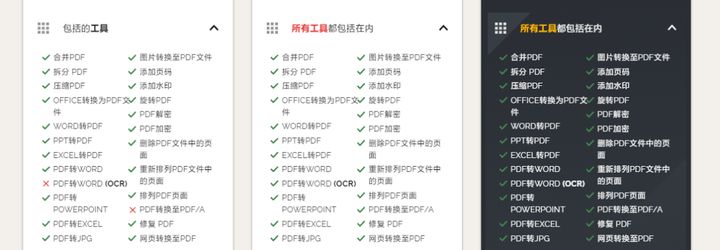 在文件处理量不大的情况下,HiPDF 会是一个比较好的选择,但不成为订阅用户的话有很多功能还是不那么自由的。从这份功能对比图来看,和前面几家“良心”相比,也差上了那么一点。