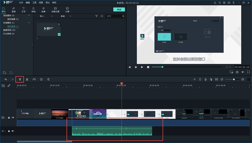 大家注意,录音过程中难免会出现一些花絮,你可以通过剪辑将其删除,然后进行重新配音,反复操作,直至达到理想效果。如图,在时间轴轨道上移动游标,将花絮片段分割出来,点击工具栏中的【删除】按钮,即可删除音频中的花絮。