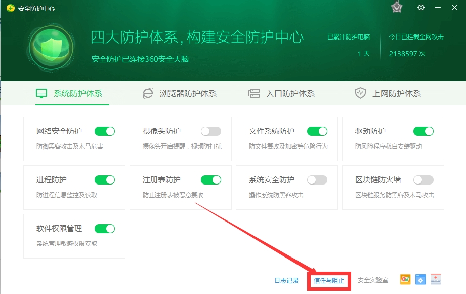 打开安全防护中心,如图,点击“系统防护体系“——“信任与阻止“,