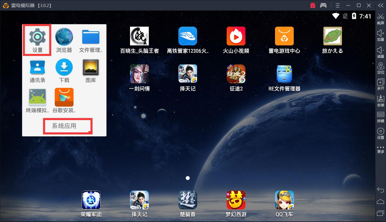 打开雷电安卓模拟器,进入界面,点击“系统应用“,选择“设置“,