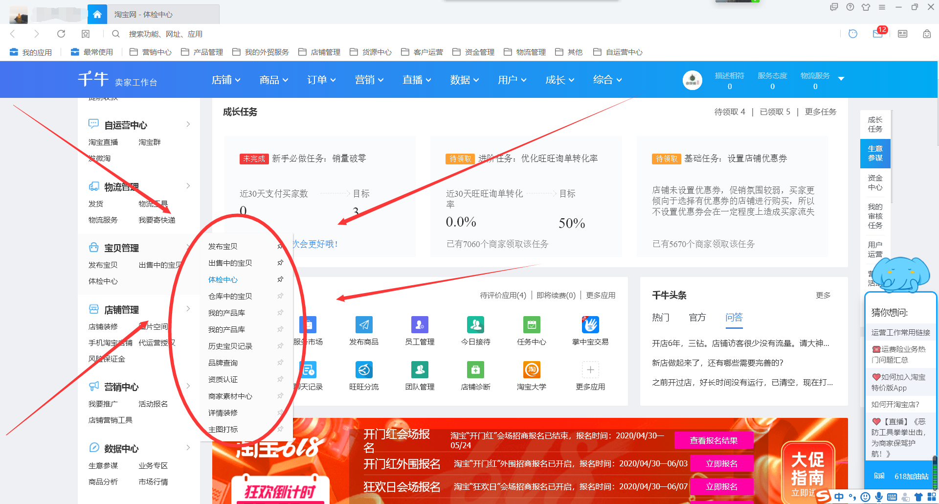 3. 点击进入体检中心,如图,正中间会显示店铺体检,然后查看违规处理及市场管理,看看自己的淘宝店铺是否出现违规,