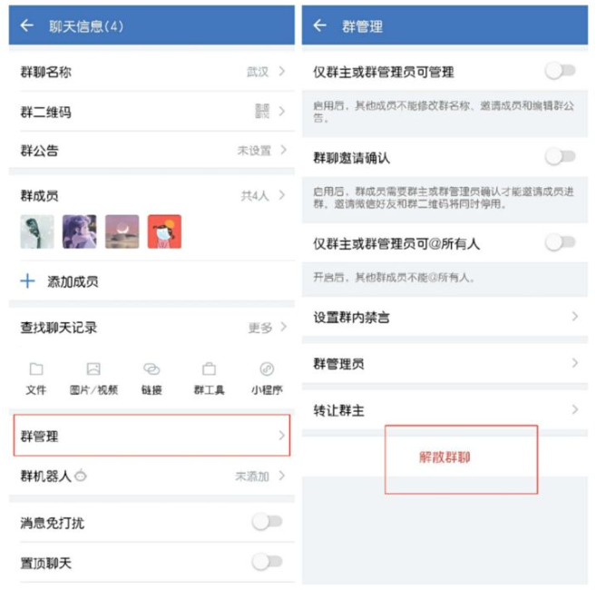 进入群聊信息页面,找到“群管理”功能,如图,下滑点击“解散群聊”,解散之后,所有群成员会自动移出群聊。