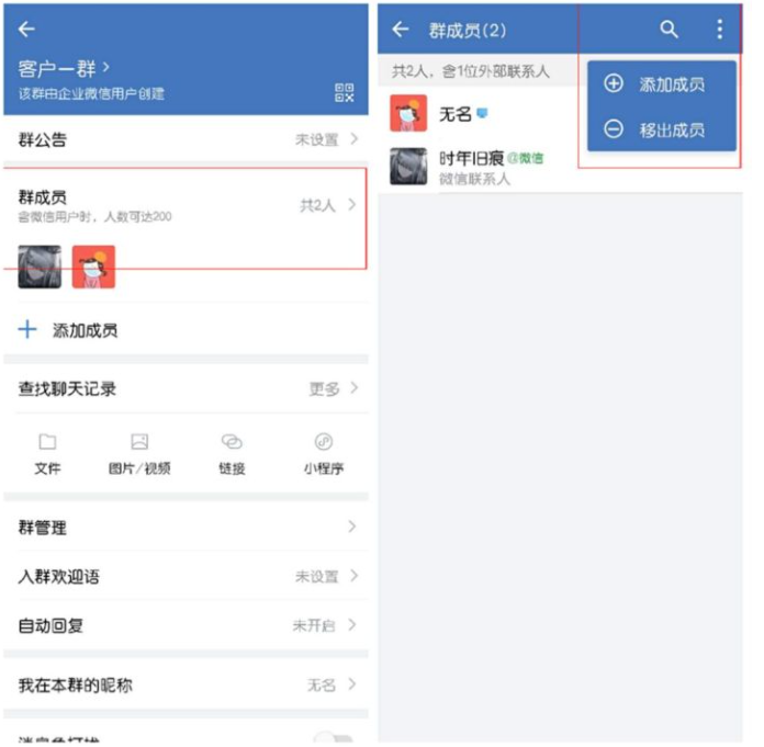 打开客户群聊窗口,进入群聊信息界面,如图,点击“群成员”,查看群成员列表,点击右上角菜单,选择“移出成员”,勾选指定对象,将其移出群组。