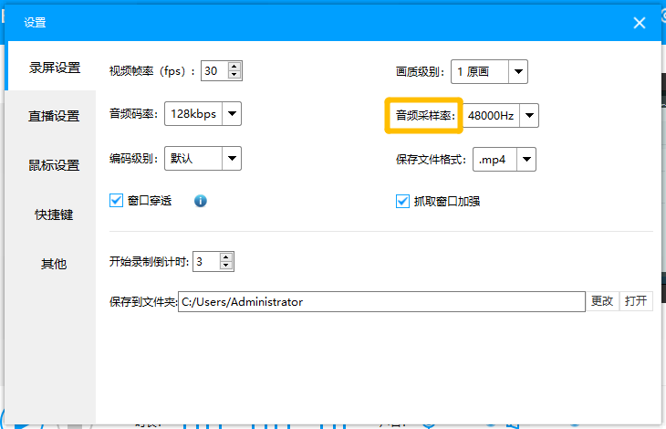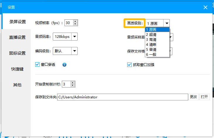 虽然设置级别越高,画质越清晰,但是录屏文件体积就越大,所以小编建议设置”原画”级别。