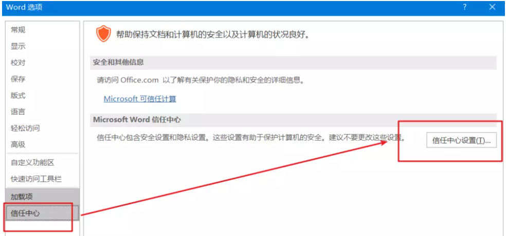 打开 Word 选项面板,如图,点击“信任中心“——“信任中心设置“,