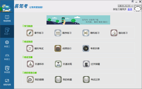 易驾考是一款驾考科目学习辅助软件,由上海互盾信息开发的三平台同步驾考学习软件。易驾考系统内包含了驾照科目考试中的各项注意事项以及攻略秘籍,严格遵循考试大纲教学要求,覆盖驾考中科目一. 科目二. 科目三. 科目四的全部环节,逐题剖析新交规. 讲解考驾照技巧,并提供章节练习. 强化练习. 全真驾考模拟器等多种功能,帮助学员轻松通过驾驶员考试!