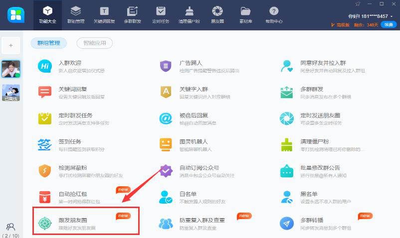 2. 然后,进入 46 助手操作界面,切换至“功能大全”选项,在页面中往下拉找到并点击“跟发朋友圈”,如下图。