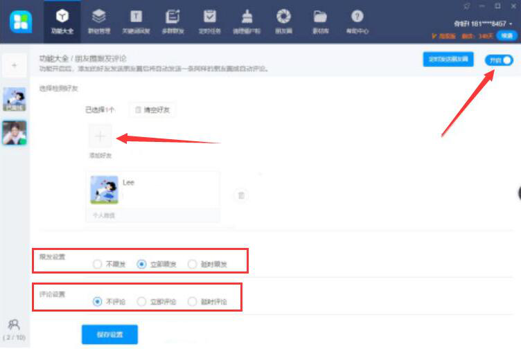 3. 接下来,进入 46 助手跟发朋友圈的设置页面。在右上方将跟发的功能开启,点击“+”,添加被跟发朋友圈的好友,再根据自己的需要设置“跟发设置”、“评论设置”。