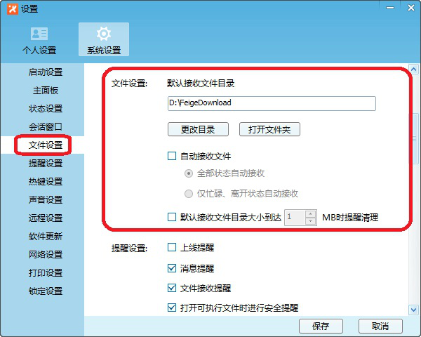 1)在文件设置中可以设置接收文件的保存位置、是否自动接收和提醒清理。