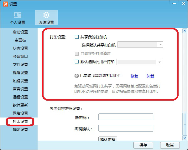 1. 使用飞鸽网络打印前,需要确认在系统设置中安装飞鸽网络打印组件。