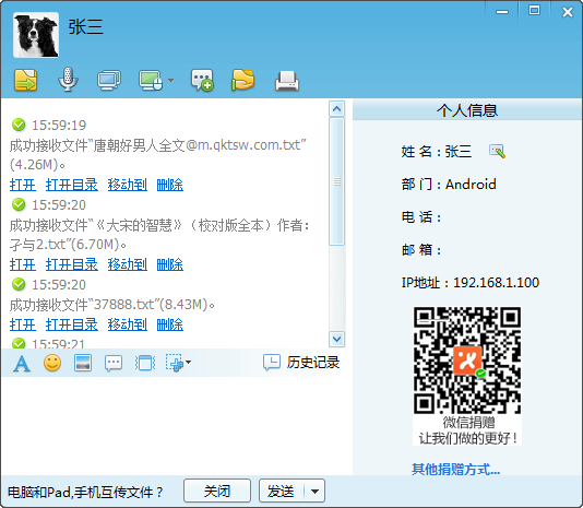 1. 同一局域网下飞鸽用户可以实现文件互传。具体做法类似QQ、微信,用户只需将要传输的文件(包括视频、音乐、文档等)直接拖拽到目标用户窗口即可。