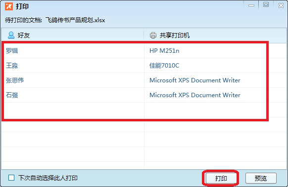 2. 打开需要打印的文件,右击选择【打印】—【飞鸽网络打印机】,然后选择好友或共享打印机进行打印。