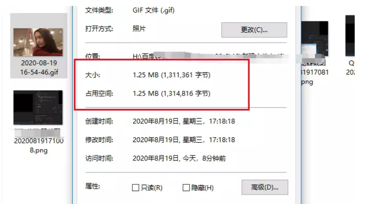 最后导出保存 GIF 文件,鼠标右击图片文件,点击查看属性,如图,体积缩小了。