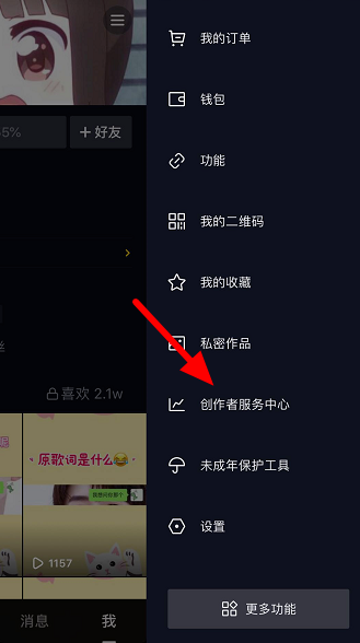 进入个人中心,如图,点击右上角的主菜单图标,弹出侧边栏,选择【创作者服务中心】,