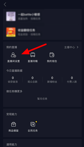 进入以下界面,如图,下拉找到【直播间设置】选项,点击它,