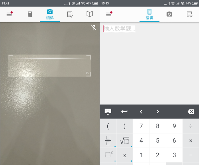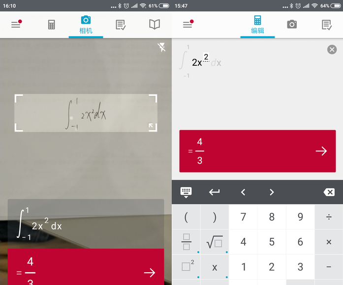 这款 Photomath 其实也是久负盛名了,在安卓和iOS平台都有发行。 Photomath 支持中文,进入到主界面后,可以看到编辑、相机等界面。你可以直接在编辑界面输入计算式,也可以在相机界面当中,直接扫描题目让APP进行计算。而在“解答”一栏,更是可以看到算式的具体解题步骤。效果如何?一起来试试!