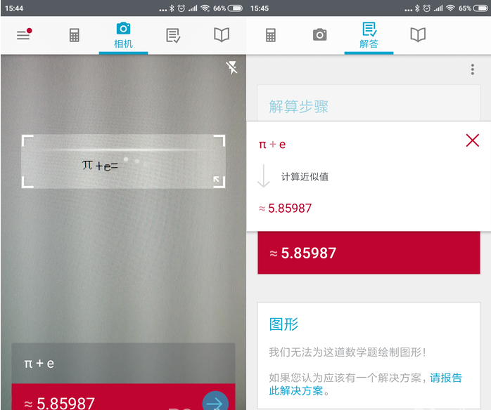 首先来试试简单的加减乘除。扫描印刷体(屏幕上)和手写体(纸上)的“π+e”,都可以准确辨认并计算出来,这完全难不倒 Photomath 嘛。