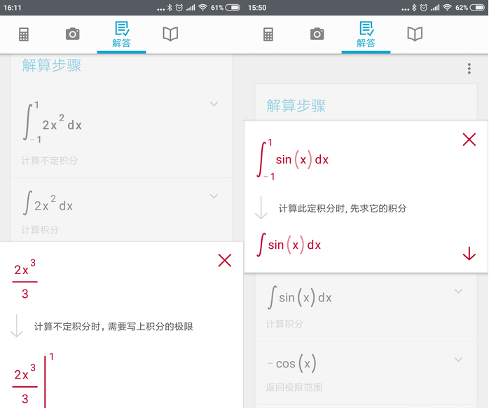 那就试试积分吧,可以看到 Photomath 的确可以识别,如果你发现识别错误,只要切换到编辑界面,可以对算式进行任意修改,小小字符的更正很容易就能实现。可以看到,Photomath 的识别和计算还是非常精确的,同时对于定积分的计算,还给出了每一步的计算步骤,可以帮助你理解高数的计算方法,其作用绝不仅仅只是让你抄答案!