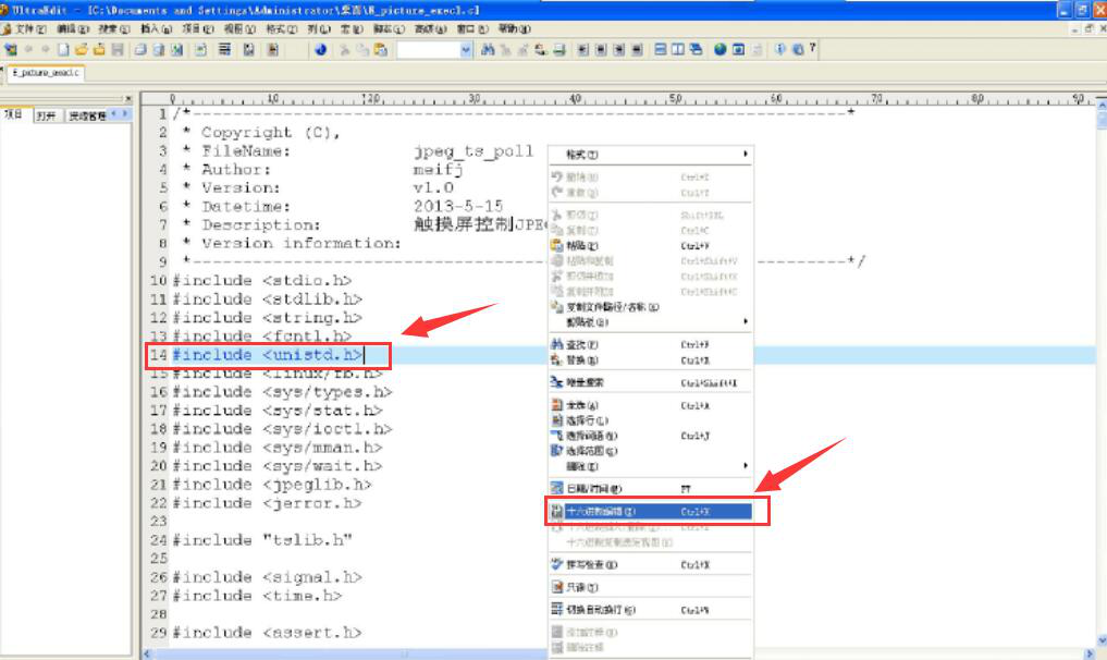 2. 在 UE 编辑器的编辑区域,可以对某个文件的信息结构进行更深入的了解。例如可以右键单击某个文件,在其菜单中点击“十六进制编辑”,对文件进一步编辑优化。