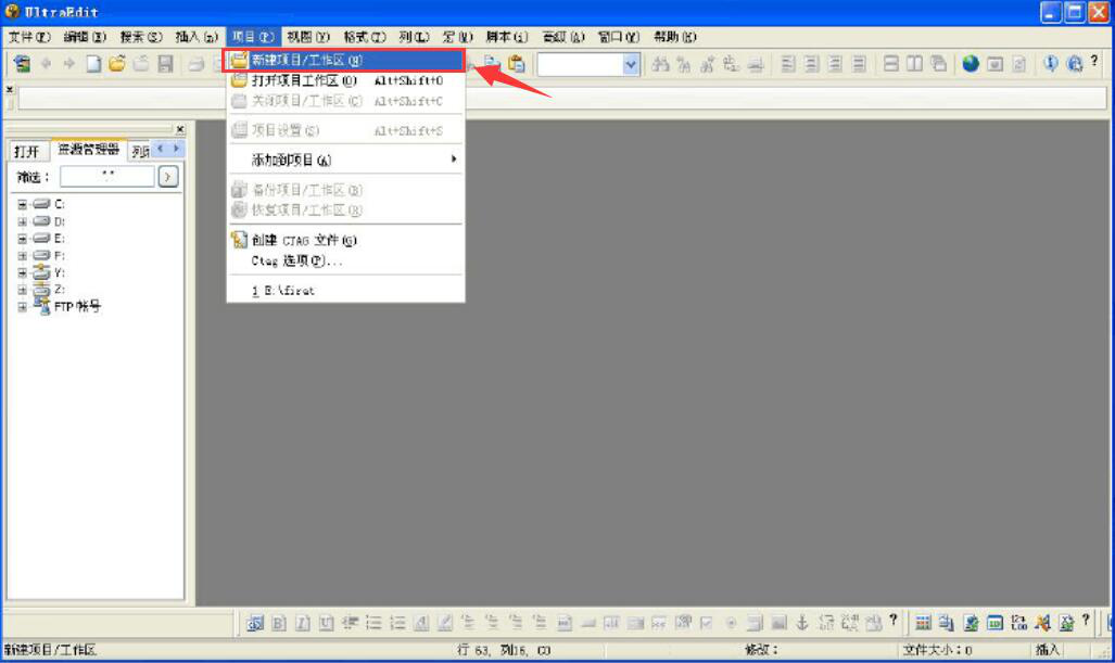 1. UE 编辑器除了可以实现文本编辑,还可以点击菜单栏中的“项目”,并从其子菜单中点击“新建项目/工作区”。
