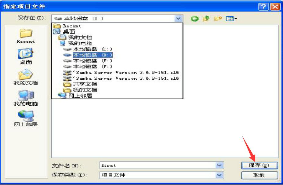 2. 在弹出来的“指定项目文件”中设置项目存放的路径和项目名称,再点击“保存”按钮。