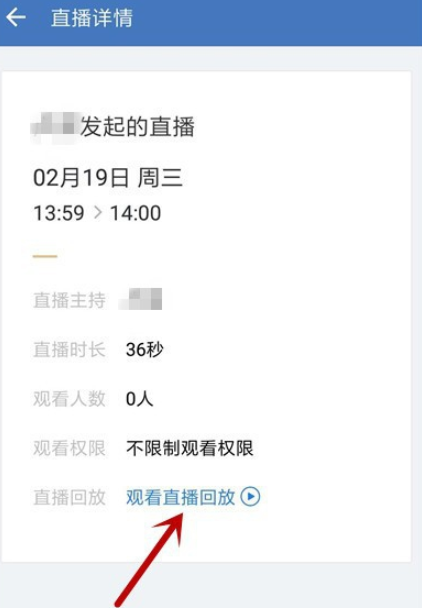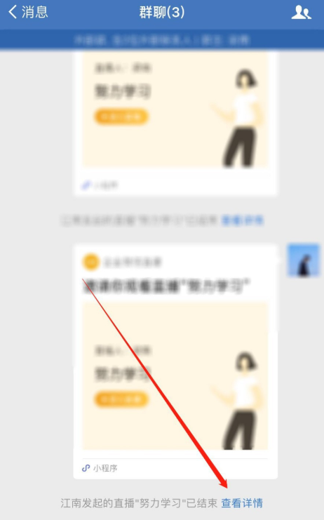 直播结束,回到群聊窗口,如图,点击“查看详情”,点击“观看直播回放”,即可回放直播,当然了,你也可以删除回放。