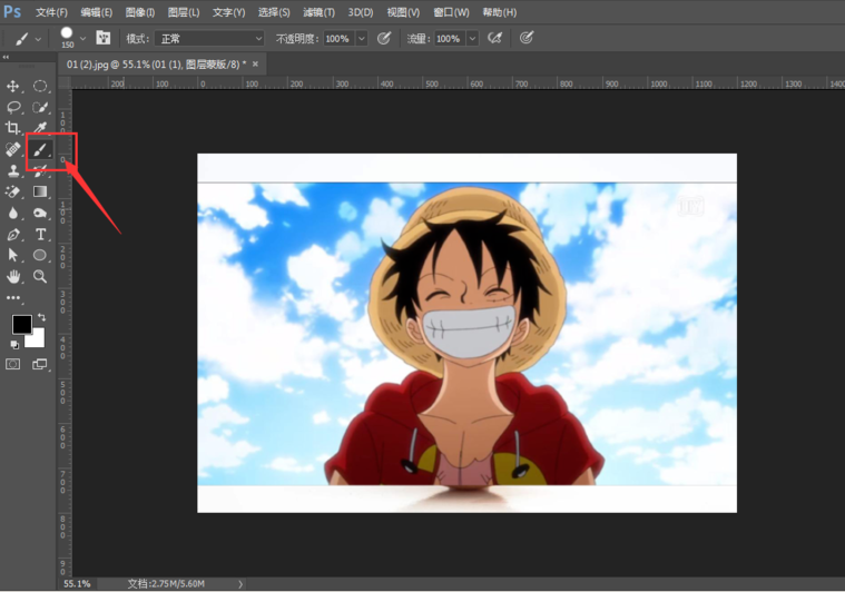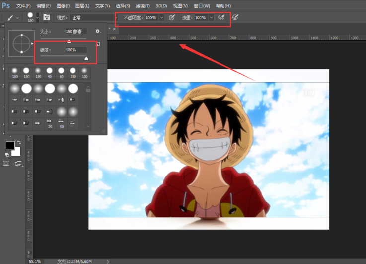 选择画笔工具,将画笔调整为硬画笔,不透明度和流量调整到 100%,将图片人物四周的背景全部涂抹掉。