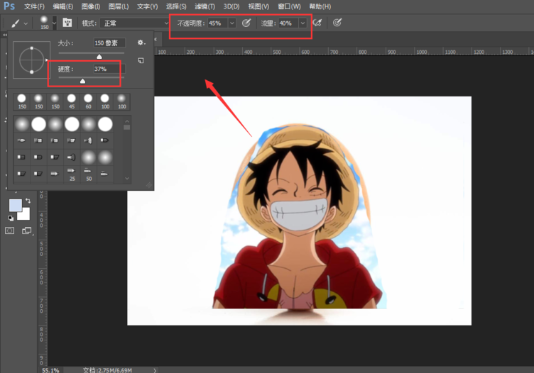 只剩下人物部分后,再将画笔改为柔画笔,降低不透明度和流量,调整人物边缘,ctrl+t 变换适当调整动漫图片大小,让动漫尽量保持在鸡蛋画面中央。