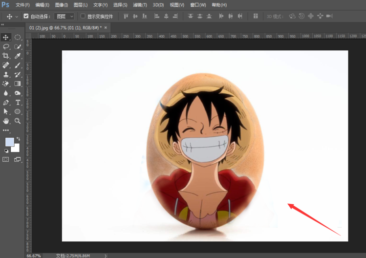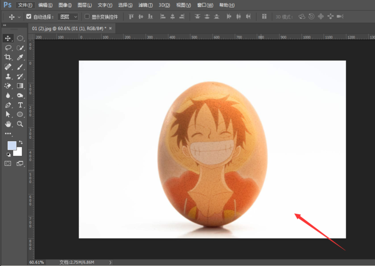 打开 Photoshop 软件,将准备好的鸡蛋图片作为底层置入到 PS 画布中,