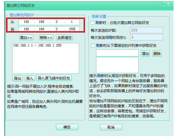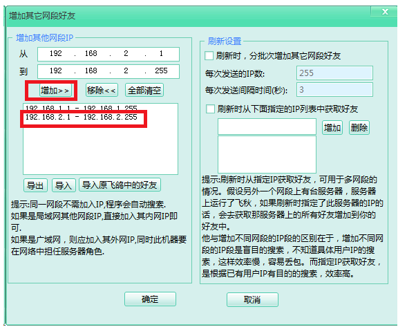 弹出对话框,如图,输入网段IP,建议可以全部加入,然后点击【增加】,重新刷新飞秋,就可以看到其他网段的好友了