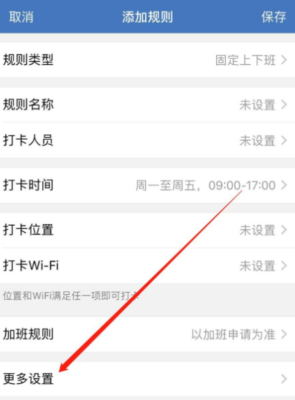 如图,点击右上角【+】,进入添加规则界面,点击【更多设置】选项,