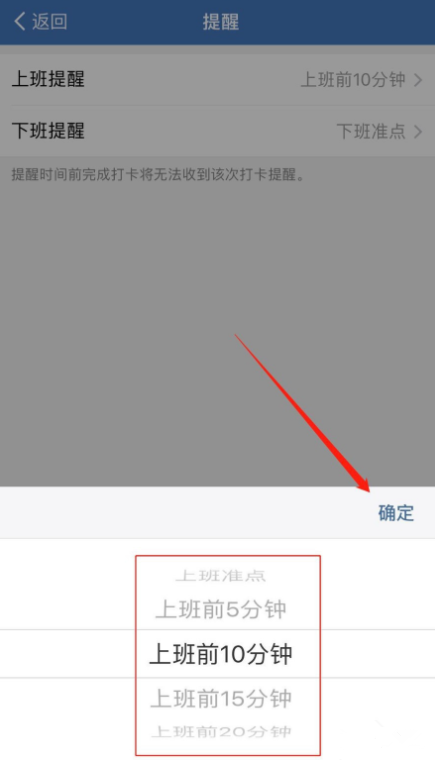 点击【提醒】,分别设置上班提醒和下班提醒,最后点击确定即可。