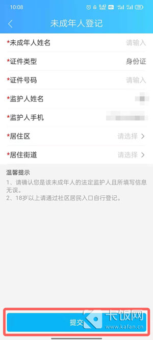 5、按照要求填写信息,需要未成年身份证号码、法定监护人号码信息,点击【提交】;