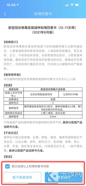 6、然后阅读知情同意书,勾选【我已阅读……】,点击【愿意接种】,不符合情况则选择【暂不愿意接种】;