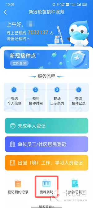 9、完成预约后,在预约的时间来到选择的门诊,打开健康云点击新冠疫苗接种,选择【接种条码】;