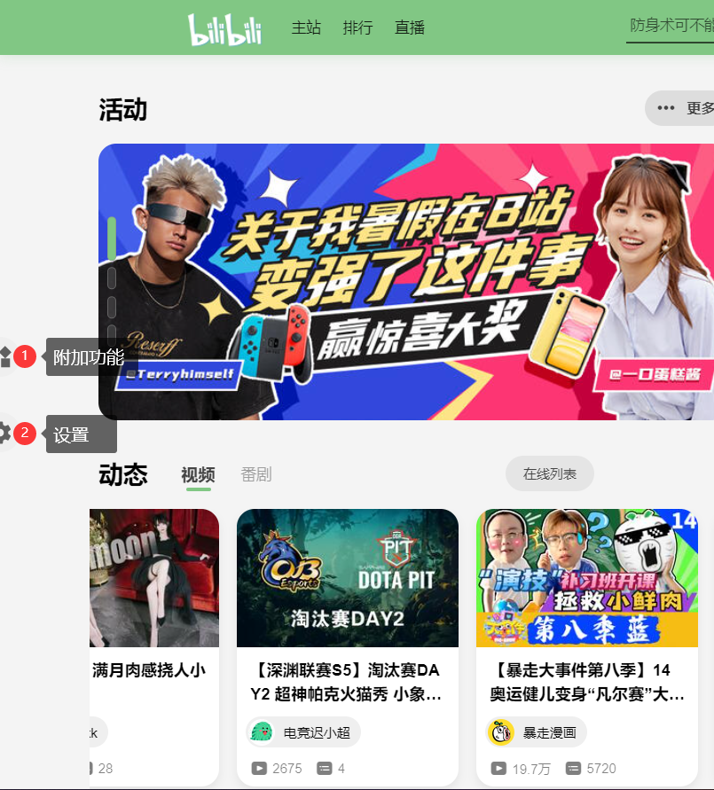 需要了解的是,安装好脚本后,B 站页面左侧会出现两个按钮,上面的是附加功能,下面的是设置,附加功能面板可能会随着设置面板的某些开关而变化。