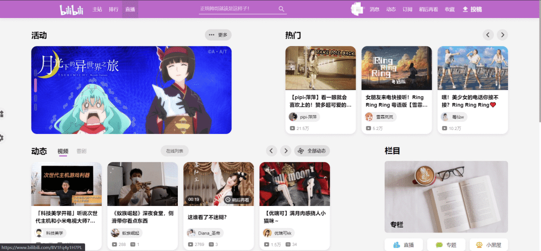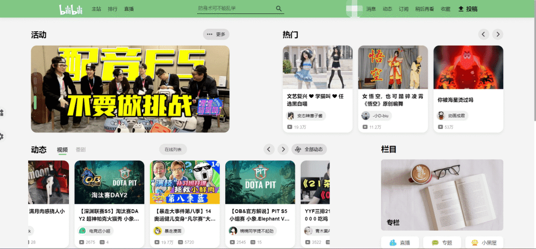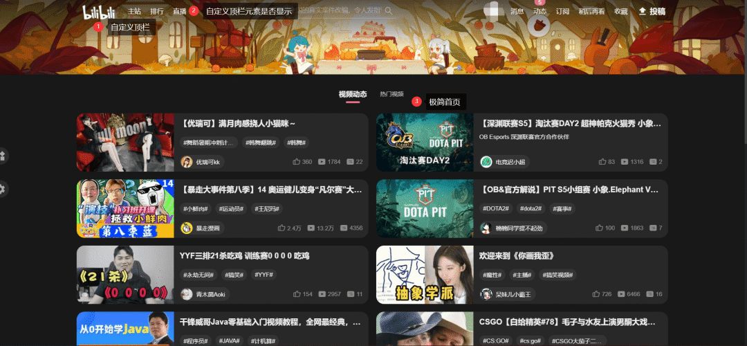 玩法很多,萝卜哥设置了一个暗黑模式的极简主页,顶栏“漫画”、“会员购”等不必要的元素也删掉了,非常清爽。