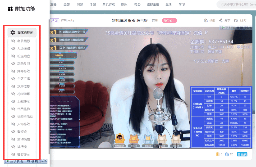 当开启了【设置】面板的【简化直播间】后进入【附加功能】面板进入【简化直播间】设置就可以进行详细的自定义,隐藏无关元素,屏蔽特效,观看体验也是非常好。