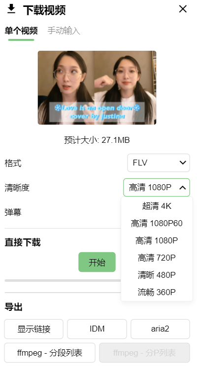 需要注意的是,视频允许下载的清晰度与自身账号有关,普通用户可以下载 1080 P 30 帧的视频。如果是大会员,还能下载 1080 P 60以及 4K 画质,其中4K画质需要点击下方的【导出】使用 IDM