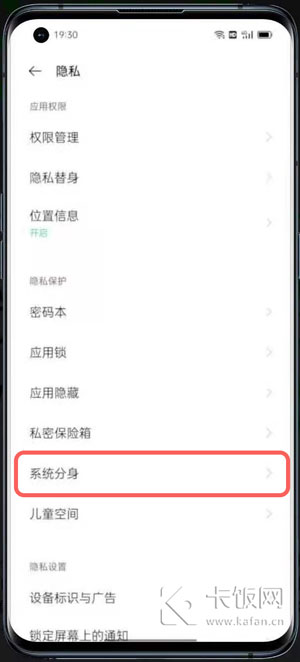 2、找到隐私设置中的【系统分身】进入开启,如果没有这个选项,则表示你的机型不支持系统分身;