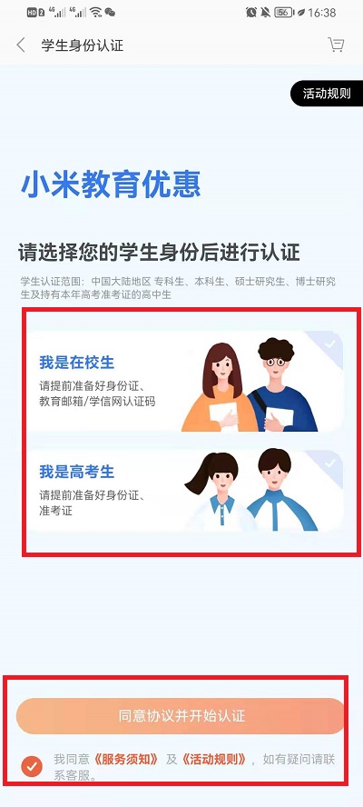 3、然后在认证界面,选择自己的学生身份,点击同意下方的协议,然后点击【开始认证】进行认证即可。