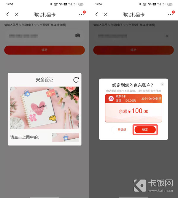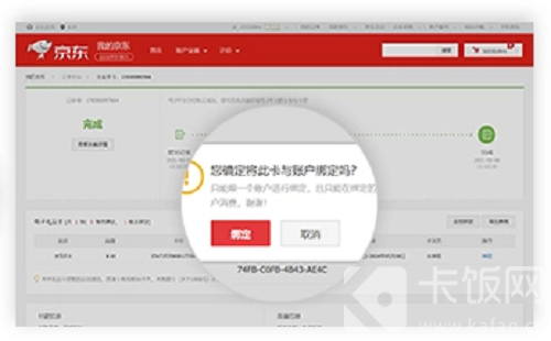 17、完成验证后获取卡密码,完成京东E卡绑定,点击【确定】即可。