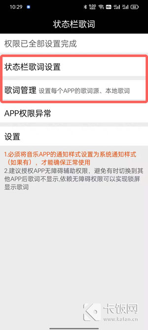 3、开启权限后,进入应用首页,首先点击【状态栏歌词设置】;