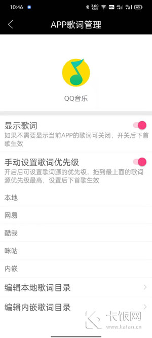 6、进入app歌词管理页面后,开启【显示歌词】、【手动设置歌词优先级】设置,将显示歌词的优先级进行设置;